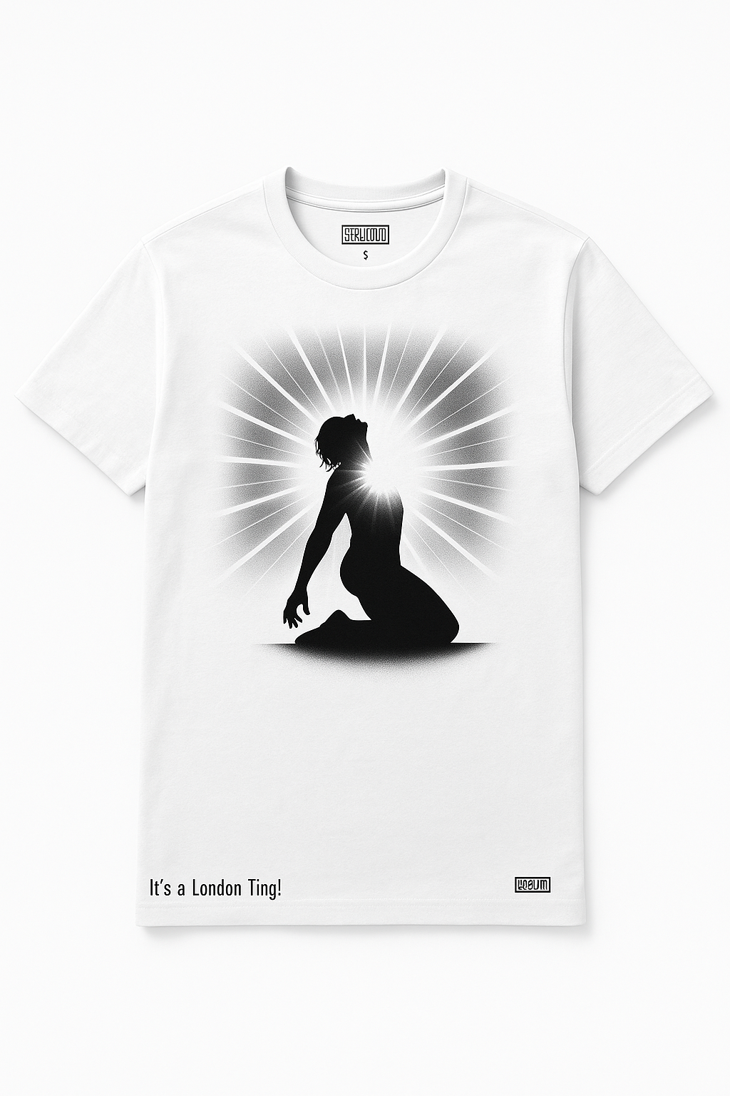 Featuring a striking black silhouette illuminated by rays of light bursting from within, this piece captures the moment of transformation — when darkness meets enlightenment. Designed for those who embody growth, strength, and evolution.